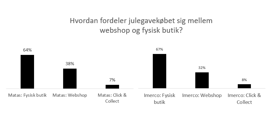 Den generelle udvikling mod øget digital handel vil naturligvis lede til overvejelser i forhold til prioritering af indsatserne digitalt vs. fysiske butikker. Vi kan dog konkludere fra sidste års julegavehandel, at de detailkæder med den bedste nationale distribution (fysiske butikker) og en velsmurt webshop vinder i de respektive kategorier. Det er altså Matas, Imerco og Elgiganten, som tager en meget stor andel af julegavekøbet i deres kategorier. Webshoppen udgør efterhånden en meget betydelig del af deres salg, men dykker vi ned i fordelingen mellem online og offline købte gaver, ser vi at hhv. Imerco og Matas fortsat får størstedelen af gaverne afsat i fysiske butikker (adspurgt data).