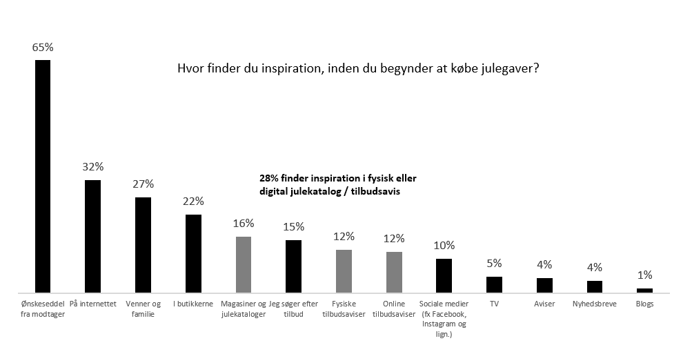 Det er med ovenstående in mente nærliggende at tænke, at markedsføringen så kan fokuseres op til Black Friday og et par uger frem for dermed at påvirke julegaveindkøberne i den periode, hvor de fleste julegavekøb foretages. Der er dog den forunderlige dynamik ved julegavehandlen, at ønskesedlerne spiller en meget stor rolle. Hele 65% af danskerne svarer, at de finder inspiration til julegavekøbene fra ønskesedlerne.