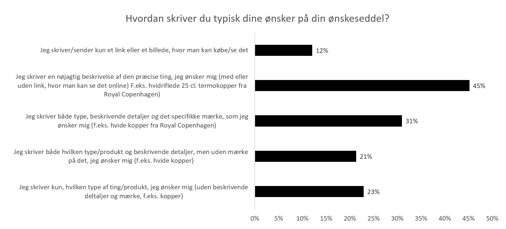 Mange af danskerne er ude i god tid med deres ønsker. 60% svarer nemlig, at ønskesedlerne er sendt inden udgangen af november (40% sendes i de sidste to uger af november). Tilføj dertil at ønskesedlerne ofte er meget specifikke og næsten kan betegnes som en indkøbsliste.