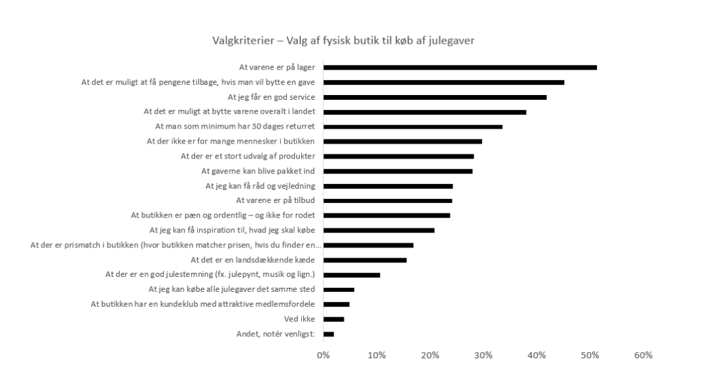 Når det kommer til valg af online webshop til sine julegaveindkøb, er valgkriterierne også mere bekvemmelighedsorienteret end prisorienteret. 51% svarer igen, at det, at varen er på lager, er et valgkriterie, ligesom 46% også svarer, at fri fragt er vigtigt. 34% nævner, at det er vigtigt, at varerne er billigere end i en fysisk butik. Qua den større gennemsigtighed digitalt fylder dette altså mere, end når der handles julegaver fysisk.