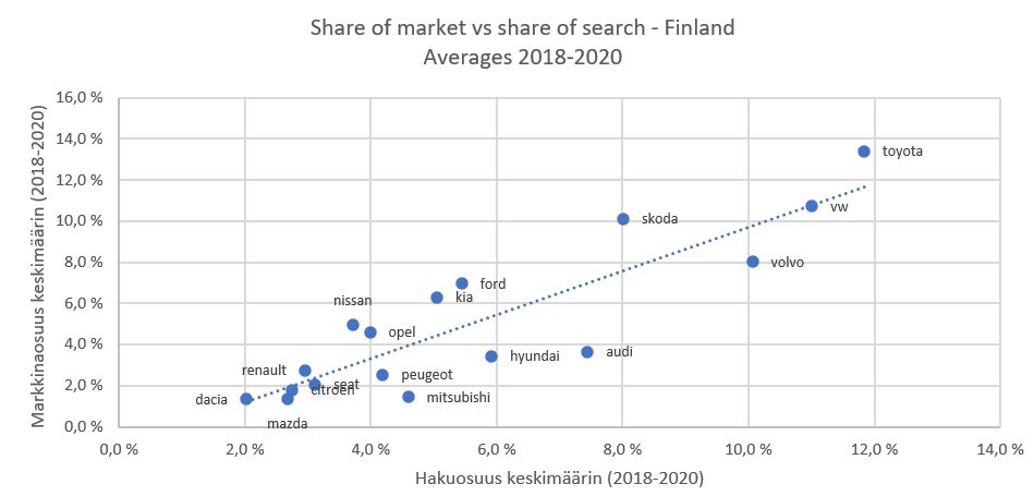 Hakujen osuus korreloi vahvasti markkinaosuuden kanssa, ja se voi myös auttaa ennakoimaan todennäköisiä muutoksia, suuntaan jos toiseen. Kun tuntee ja tunnistaa muutokset, on organisaatioiden mahdollista reagoida muutoksiin heti, eikä liian myöhään. Alla on esimerkki Suomen automarkkinasta, johon ajoimme markkinaosuudet ja hakuosuudet. Kuvasta 1. voidaan selkeästi havaita hakuosuuksien ja markkinaosuuden välinen vahva korrelaatio.