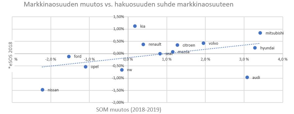 Tutkimalla markkinaosuuksien ja hakuosuuksien muutoksia Suomen automarkkinassa vuosien 2018 ja 2019 välillä (kuvassa 2), voidaan havaita että kausaliteetti kulkee hakuosuuksien muutoksesta markkinaosuuteen. Automerkeillä, joiden vuoden 2018 hakuosuuden erotus saman vuoden markkinaosuuteen (eSoS = SoS-SOM) oli positiivinen, ottivat markkinaosuutta vuonna 2019 Audia lukuun ottamatta. Vastaavasti negatiivisen erotuksen omaavat merkit menettivät markkinaosuuttaan.