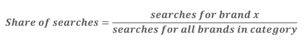 Miten share of search sitten lasketaan? Ensimmäiseksi kannattaa määritellä kategorian kilpailijat, jotka halutaan ottaa tarkasteluun mukaan. Tämän jälkeen laskutoimitus on yksinkertainen, brändisi haut jaettuna kategorian kilpailijoiden kaikilla brändihauilla.