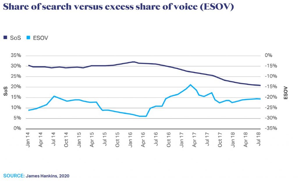 Markkinoinnin investointitasoja kannattaa tarkastella hakuosuuksia vasten. Share of Voice (SOV) markkinoinnin investoinnit kannattaa konvertoida rullaavaksi vuositotaaliksi ja verrata hakuosuuden 12 kuukauden liukuva keskiarvo ja siten laskea Excess Share of Voice (ESOV) joka indikoi keskipitkän ja pitkän aikavälin markkinaosuuskehitystä. Alla olevassa kuvassa on havainnollistettu pitkän aikavälin lasku hakuosuudessa verrattuna negatiiviseen ESOV:iin. Asiayhteyteen vaikuttavat tekijät pelaavat luonnollisesti merkittävää roolia laskussa, mutta voidaan olettaa markkinoinnin investointistrategian olevan tehoton tai strategia on väärä.
