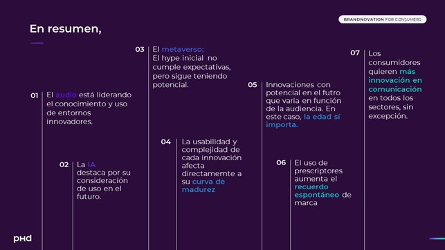 El estudio consiste en tres fases, la primera, verificar que todas las innovaciones tienen un impacto en el día a día del consumidor, tales como el podcast, los altavoces inteligentes, la IA y el metaverso. La segunda fase, entender en profundidad la curva de madurez actual de cada uno de los entornos innovadores, qué velocidad llevan en la vida de los consumidores, y cuál es su potencial a futuro, gracias a un score de potencialidad creado adhoc para el estudio. Por último, descubrir cómo correlaciona cada innovación con los diferentes sectores, así como las oportunidades que las marcas tienen de conectar con sus consumidores.